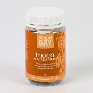 Local macadamias honey-roasted in house, coated in creamy milk couverture chocolate and finished with marbled white chocolate.