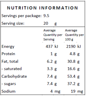 May be present: almond, macadamia, peanut, cashew, hazelnut, wheat.