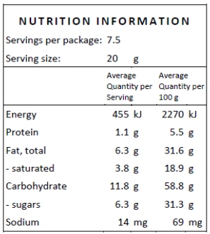 May be present: almond, macadamia, peanut, cashew, hazelnut, wheat.